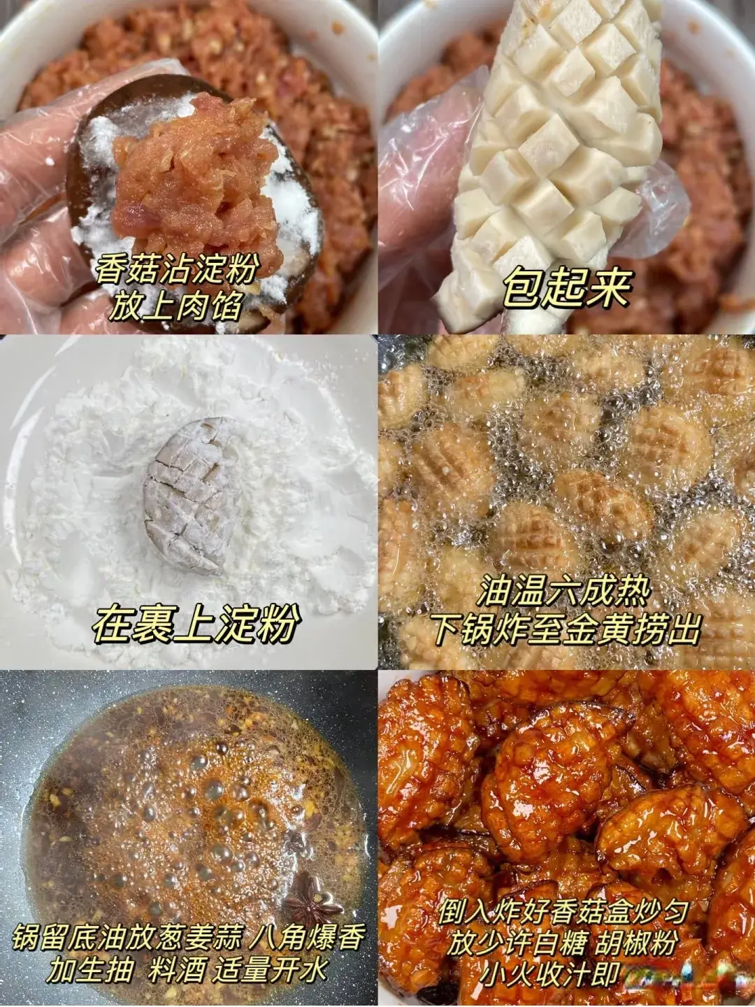 食材:香菇6朵、鲍鱼罐头1罐、虾仁100克、鸡蛋1个、淀粉适量